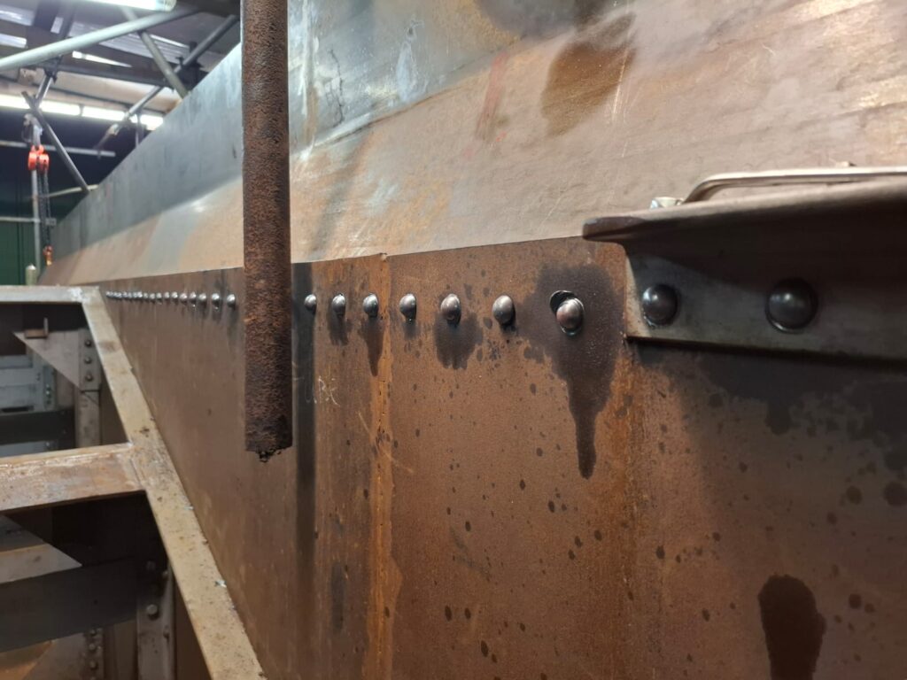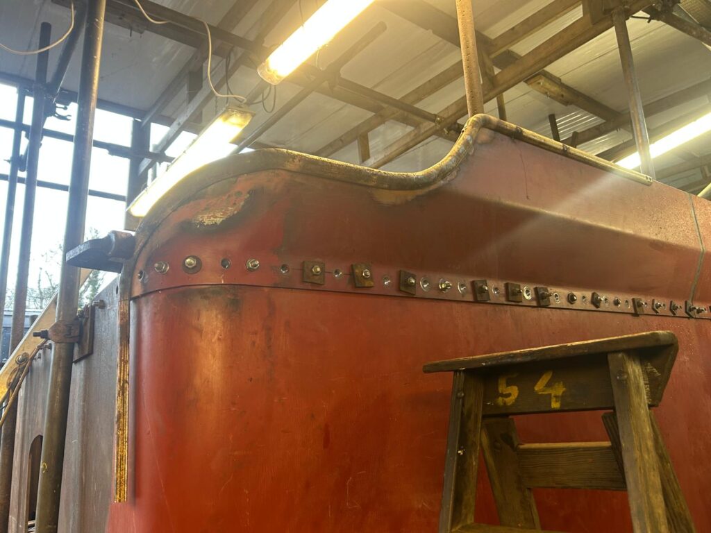 Not content with bolting the tender coal raves in place before the end of the year, we have now riveted a significant section along the driver’s side. The curved front of the rave and the first of the beading is now also in place.