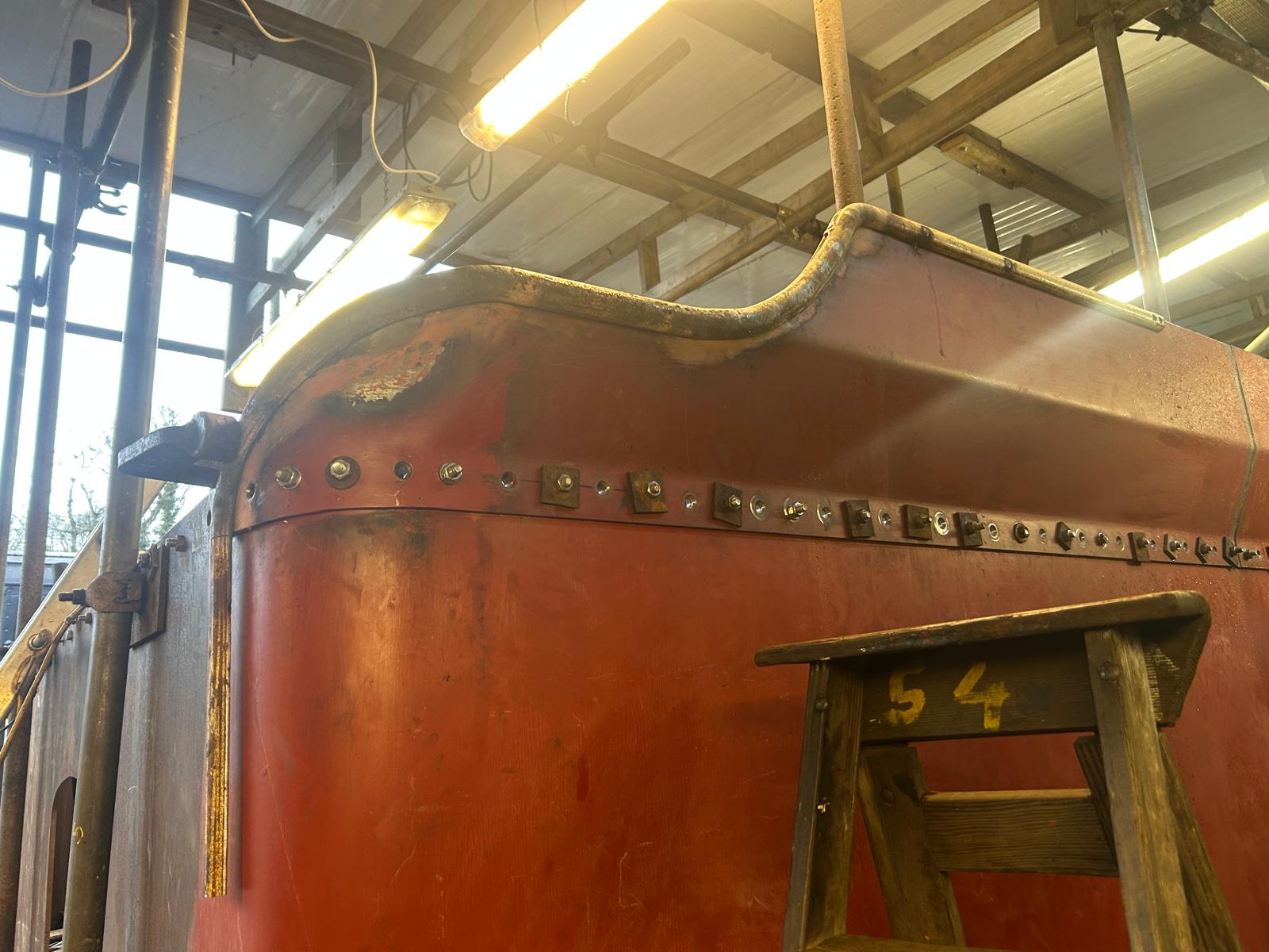 Not content with bolting the tender coal raves in place before the end of the year, we have now riveted a significant section along the driver’s side. The curved front of the rave and the first of the beading is now also in place.